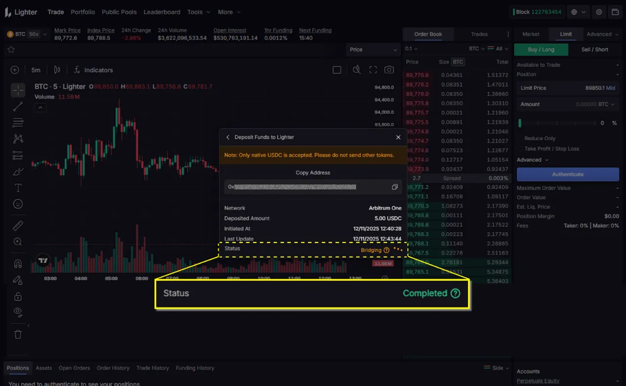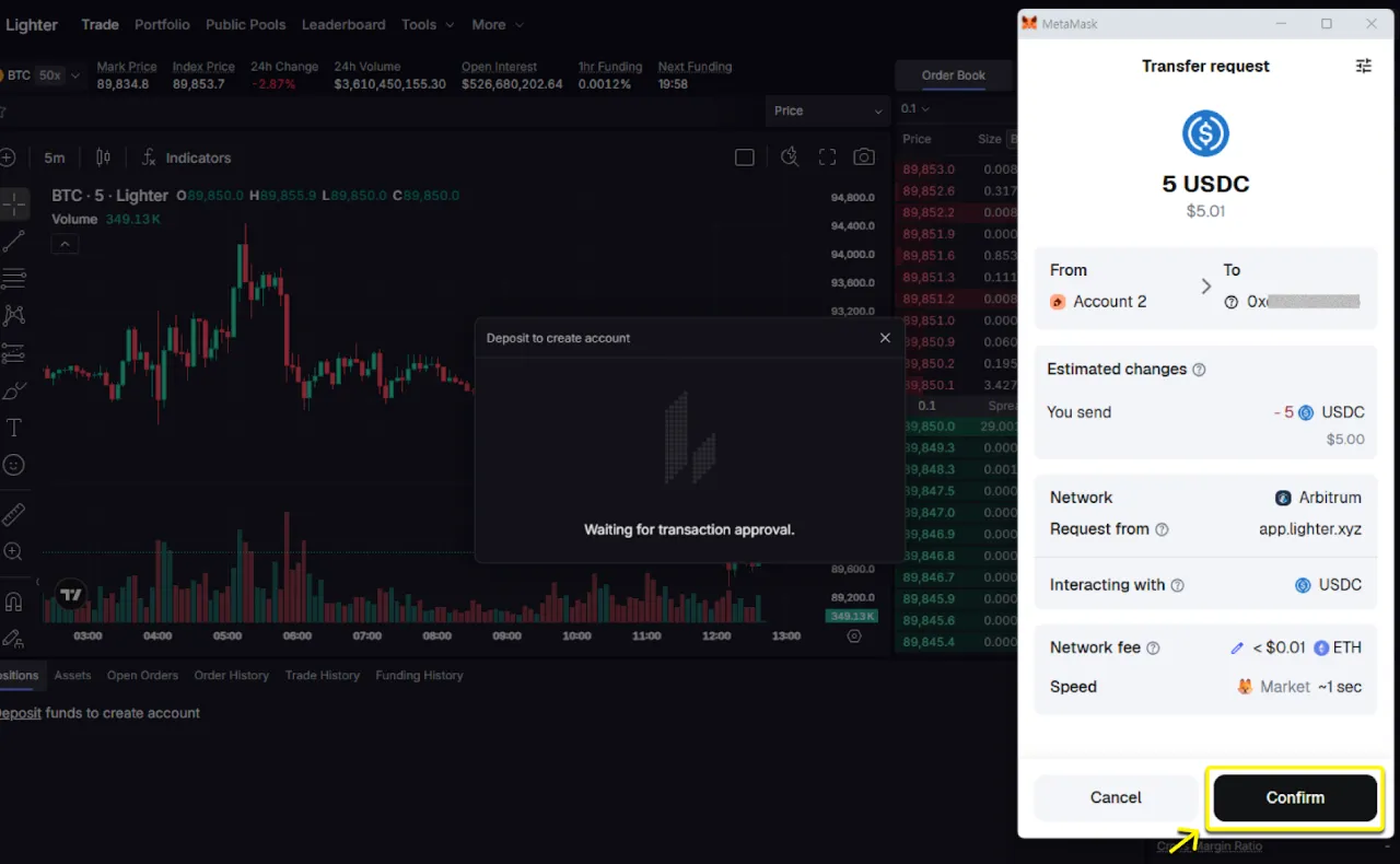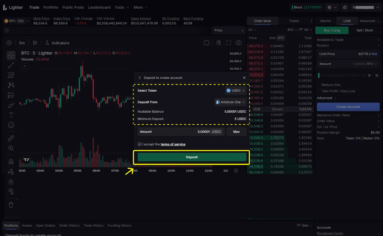 - 최소 5 USDC (Arbitrum 체인) — 실제 입금에 사용