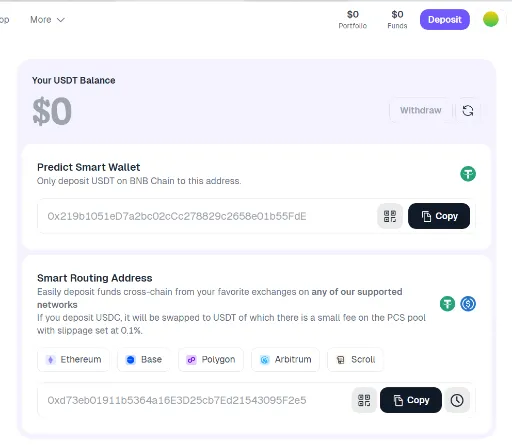 (3) 화면 우측 상단 'Deposit' 버튼을 누른 후 생성된 지갑 주소로 자금 입금