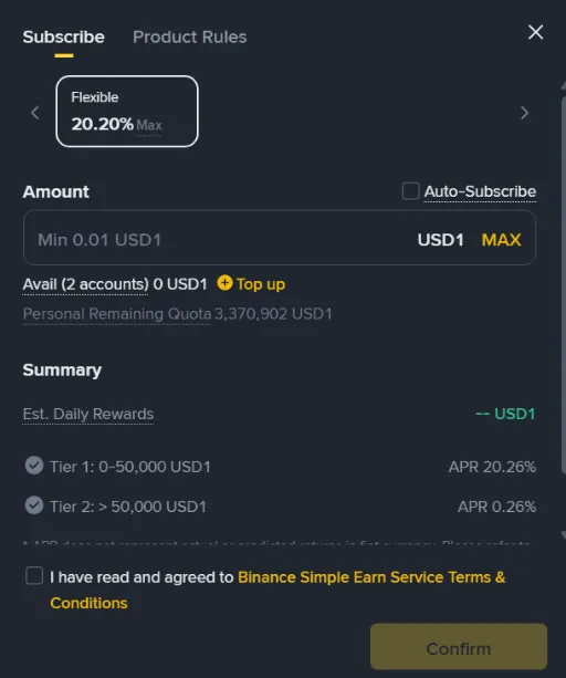 ✅ USD1을 예치할 경우 최대한도 $50,000 내에서 연이자 20.2%를 제공합니다.
