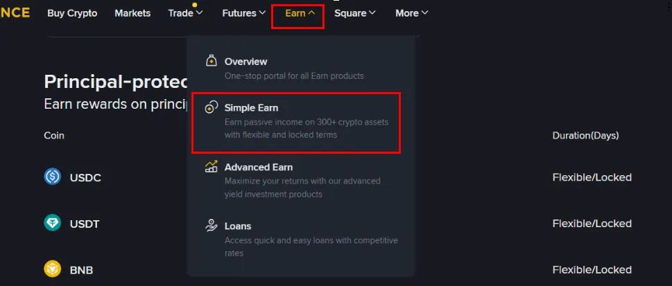(2) 화면 상단 'Earn' 탭의 'Simple Earn' 페이지로 이동