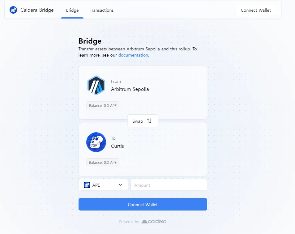 (4) 브릿지 페이지로 이동후 Curtis 테스트 네트워크에서 아비트럼 세폴리아 테스트 네트워크로 APE 토큰을 전송.