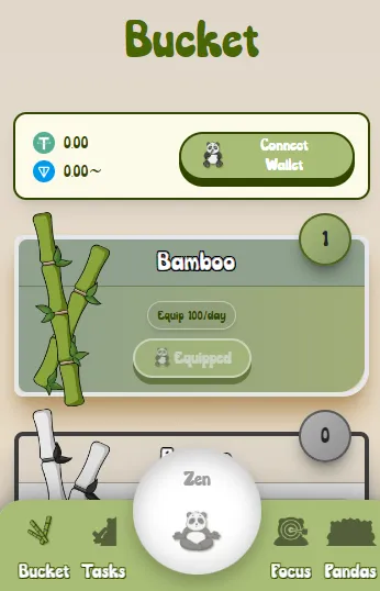 (3) 버켓 탭에서 지갑을 연결하고 획득한 대나무를 장착