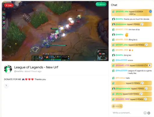 (5) 방송을 시청하면서 'LIKE' 버튼 클릭 및 채팅창에 있는 'Send Tip' 을 이용해 소량의 팁 전송