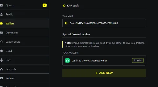 (2) 우측 상단의 프로필을 열어 'Wallets' 탭으로 이동후 앱스트랙트 월렛 연결 (Login 클릭 후 Connect 클릭)
