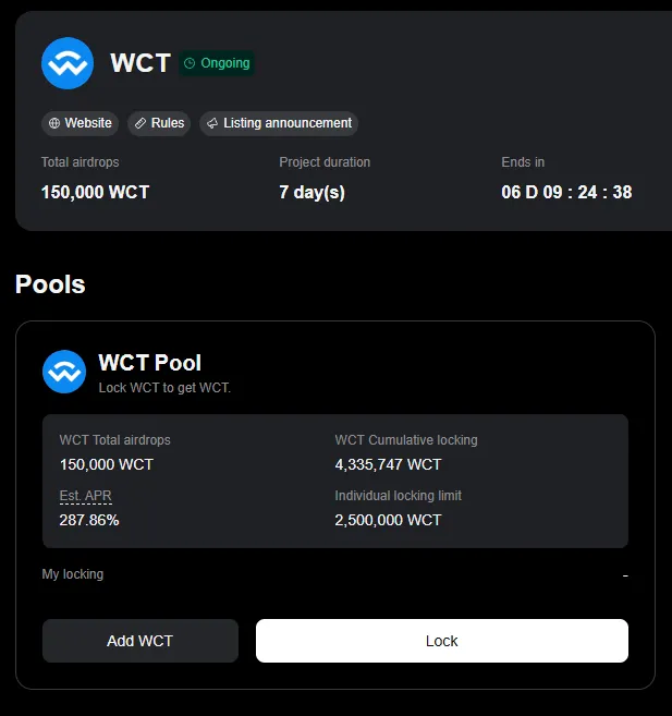 (2) WCT 풀에서 락업 및 런치풀 참여 (최대 락업 물량 : 2,500,000 WCT)