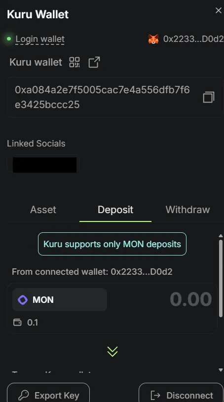 (3) 우측 상단 지갑을 열고 메타마스크 월렛에 보관중인 테스트넷 모나드를 쿠루 월렛으로 입금