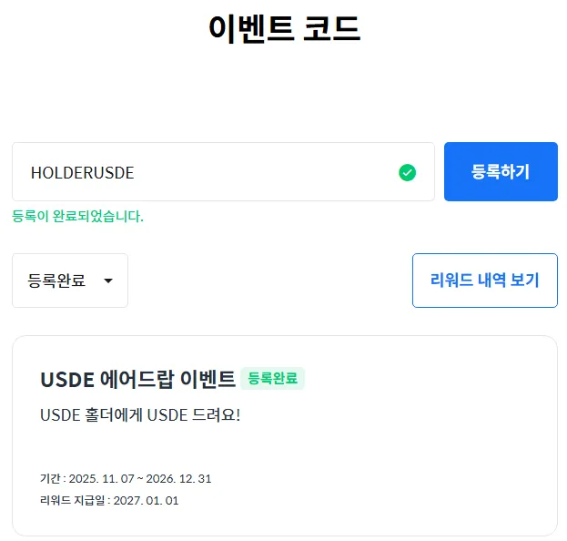 (1) 👉이벤트 코드 등록페이지👈에서 코드 등록 (이벤트 코드 : HOLDERUSDE)