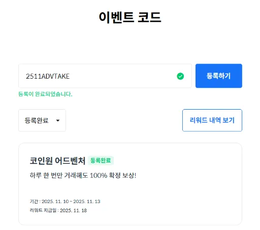 (1) 👉이벤트 코드 등록페이지👈에서 코드 등록 (이벤트 코드: 2511ADVTAKE)