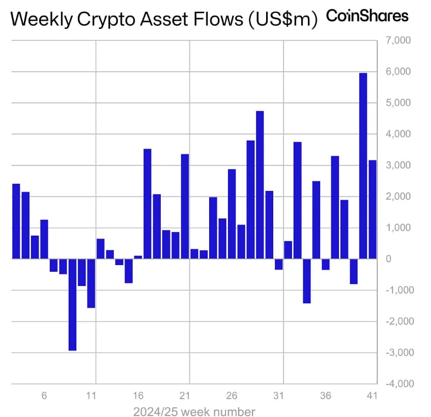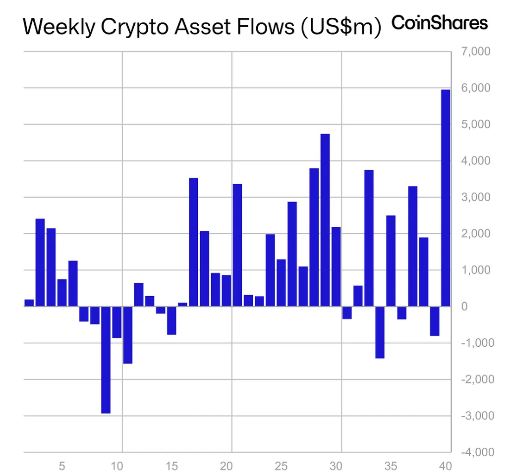 지난주 디지털 자산 투자 상품에 59억 5000만 달러(한화 8조 4156억원)가 순유입됐다고 코인쉐어스가 전했다. 주간 기준 사상 최대 유입액이다. 비트코인 투자 상품에 50억 달러가 유입됐으며, 이더리움 투자 상품에는 14억 8000만 달러가 순유입됐다. 이밖에 SOL(7.06억 달러), XRP(2.19억 달러)도 순유입을 기록했다. 국가별로는 미국이 50억 달러로 최대 유입을 보였고, 스위스(5억 6300만 달러)와 독일(3억 1200만 달러)도 역대 최대 유입액을 기록했다.