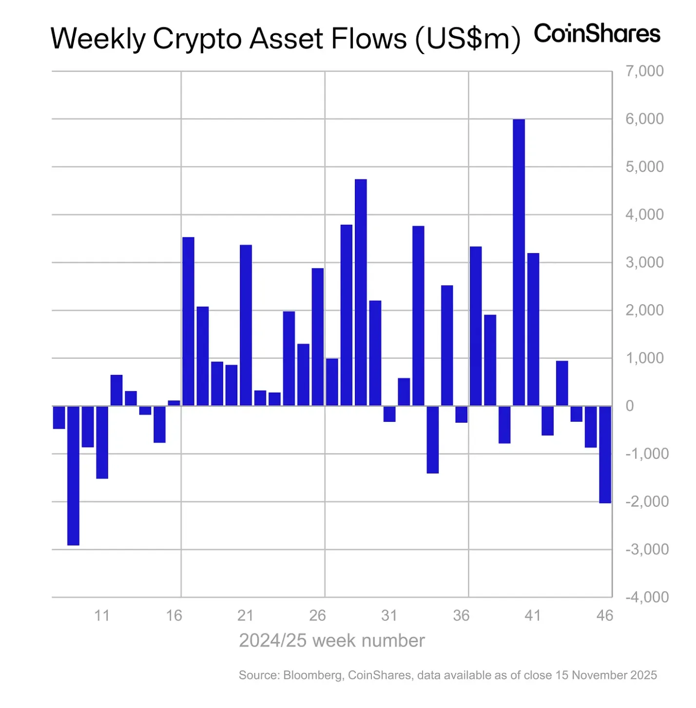 디지털 자산 투자상품에서 지난 2월 이후 최대 규모의 주간 순유출이 나타났다고 코인쉐어스(CoinShares)가 전했다. 지난주 디지털 자산 ETP에서의 자금 유출 규모는 20억 달러(한화 2조9236억원)로 집계됐다. 이 중 미국이 19억 7000만 달러로 순유출 대부분을 차지했다. 또 코인 별로는 BTC 투자상품에서 13억8000만 달러가, ETH 투자상품에서 6억8900만 달러가 순유출됐다. 코인쉐어스는 “이번 순유출은 통화 정책의 불확실성과 암호화폐 투자자들의 매도세가 복합적으로 작용한 것이 원인인 것으로 분석된다. 최근 가격 하락으로 디지털 자산 ETP의 총 운용자산(AUM)은 10월 초 최고치인 2,640억 달러에서 1,910억 달러로 27% 감소했다”고 설명했다.