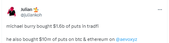 탈중앙화 암호화폐 구조화 상품 프로토콜 리본파이낸스(RBN)의 공동 설립자 줄리안(Julian)이 15일 자신의 트위터를 통해 영화 '빅쇼트'의 실제 주인공이자 2008년 금융위기를 예측한 마이클버리 사이언 자산운용 최고경영자(CEO)는 전통 금융(TradFi)에서 16억 달러 상당의 풋옵션을 매수했으며, 리본파이낸스 산하 탈중앙화 암호화폐 옵션 거래소 아이보(Aevo)에서 1,000만 달러 규모의 비트코인 및 이더리움(ETH) 풋옵션을 매수했다"고 주장했다.