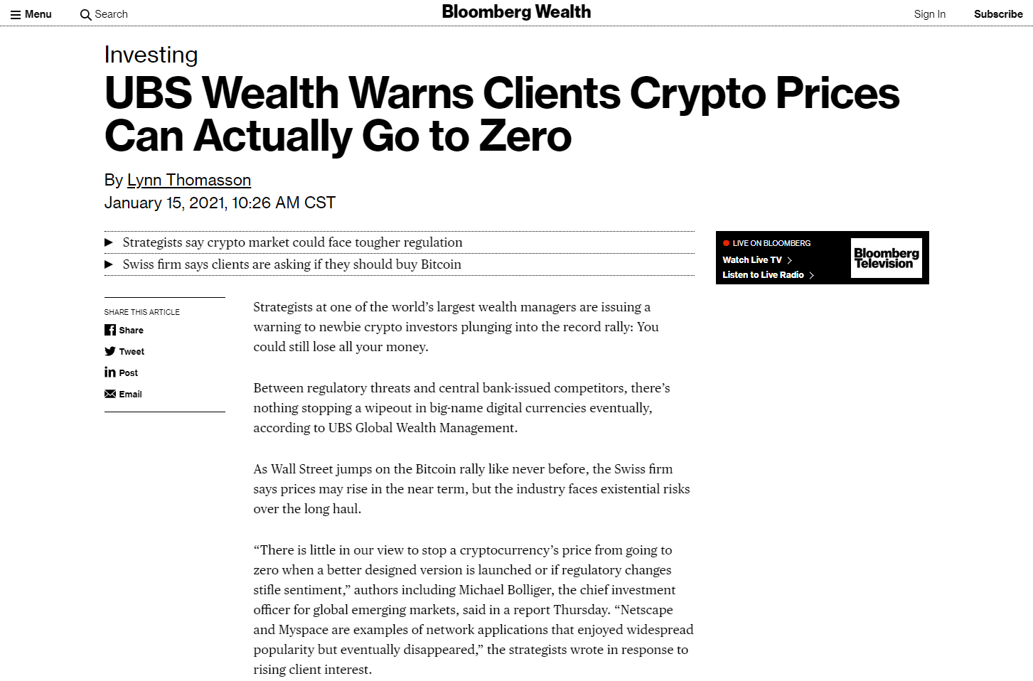 스위스 UBS “장기적 관점, 암호화폐 생존 위기 직면”