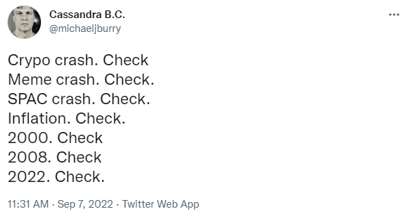 대표적인 암호화폐 비관론자 가운데 한명인 영화 빅 쇼트의 실제 주인공 마이클버리가 오늘 오전 트위터를 통해 암호화폐가 붕괴 중이라고 언급했다. 그는 2000년 닷컴 버블과 2008년 금융 위기 이후 인플레이션과 기업인수목적회사(SPAC·스팩) 시장 붕괴, 밈 주식 폭락 등을 거론하며 '암호화폐 붕괴(Crypo crash)가 일어났다'고 설명했다.