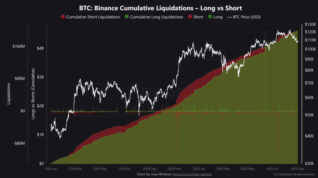 이번 사이클 상승장에서 처음으로 롱(공매수) 포지션 청산 규모가 숏(공매도) 규모를 웃도는 등 숏스퀴즈 발생 가능성이 커졌다는 전망이 나왔다. 크립토퀀트 기고자 보리스D(BorisD)는 “바이낸스 누적 청산(Cumulative Liquidations, CL) 데이터상 롱 포지션 청산 규모가 숏 규모를 700만 달러 웃돌았다. 지난 1일 기준 누적 숏 청산 규모는 46억 2700만 달러, 롱은 46억 3400만 달러 수준이다. 이는 롱과 숏 양쪽 모두 대규모 청산을 겪었지만 최근 롱 포지션 청산이 더 집중되고 있음을 나타낸다. 따라서 다음 타깃은 숏 포지션이 될 가능성이 높다. 통상 누적 숏 포지션이 앞설 때는 롱 포지션이 대거 쌓였다가 청산되고 있음을 뜻한다. 누적 롱 포지션이 앞설 때는 반대로 해석할 수 있다. 결과적으로 롱 포지션 청산이 숏 포지션 청산 규모를 넘어섰다는 것은 이번 롱 스퀴즈가 마무리 단계에 접어들었음을 보여준다“고 강조했다.