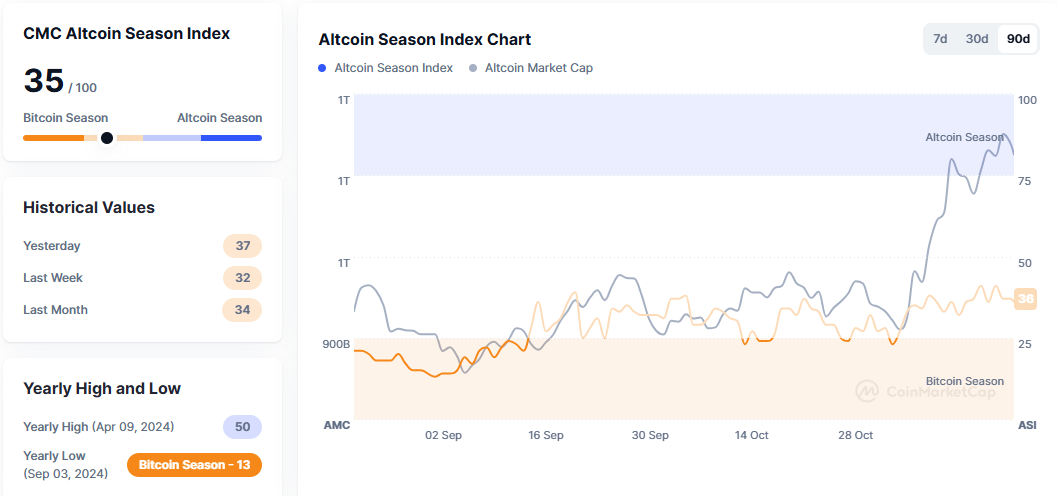 알트코인시즌지수 35...전일比 2포인트↓