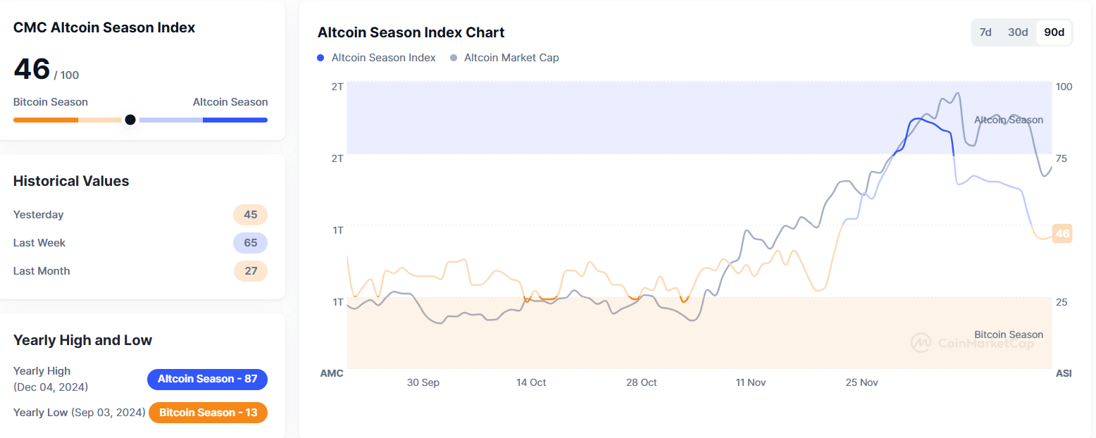 가상자산 종합 정보플랫폼 코인마켓캡의 '알트코인시즌지수'가 한국시간 9시 30분 기준 46을 기록했다. 전일 대비 1포인트 상승했다. 알트코인시즌지수는 시가총액 상위 100개 코인(스테이블·랩트 코인 제외)과 비트코인 간 가격 등락률을 비교해 책정된다. 상위 100개 코인 중 75%의 상승률이 지난 90일 동안 비트코인 상승률보다 높으면 알트코인시즌, 반대의 경우 비트코인 시즌으로 판단한다. 100에 가까울수록 알트코인시즌으로 본다.