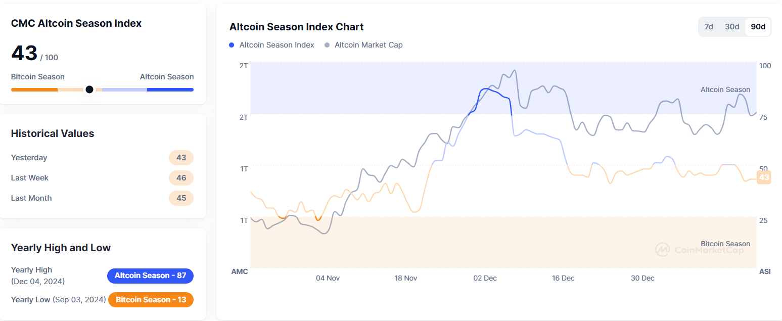 알트코인시즌지수 43...전일과 동일
