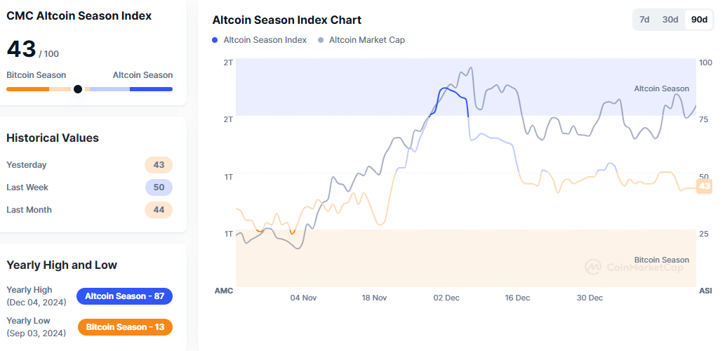 알트코인시즌지수 43...전날과 동일