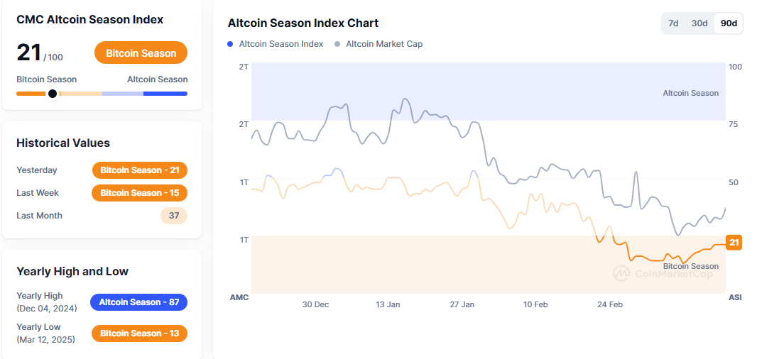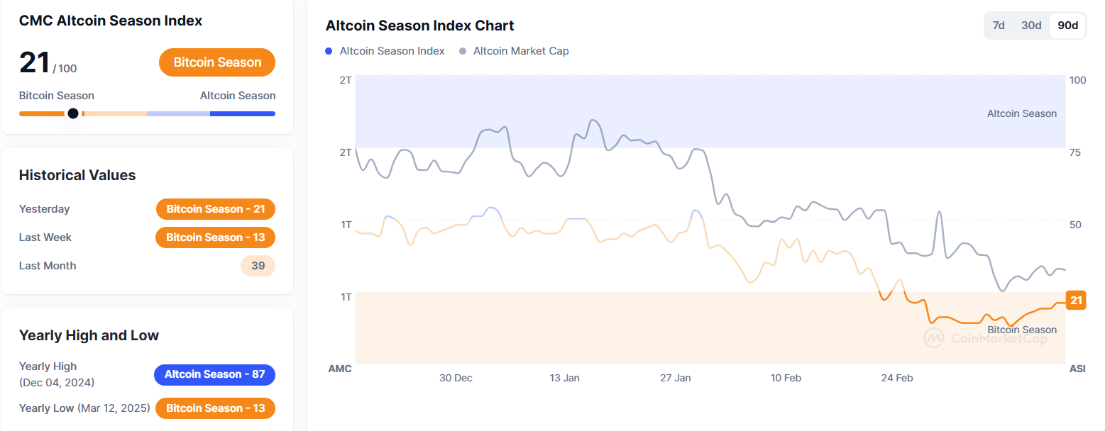 가상자산 종합 정보플랫폼 코인마켓캡의 '알트코인시즌지수'가 전일 대비 3 포인트 내린 21을 기록 중이다. 알트코인시즌지수는 시가총액 상위 100개 코인(스테이블·랩트 코인 제외)과 비트코인 간 가격 등락률을 비교해 책정된다. 상위 100개 코인 중 75%의 상승률이 지난 90일 동안 비트코인 상승률보다 높으면 알트코인시즌, 반대의 경우 비트코인 시즌으로 판단한다. 100에 가까울수록 알트코인시즌으로 본다.