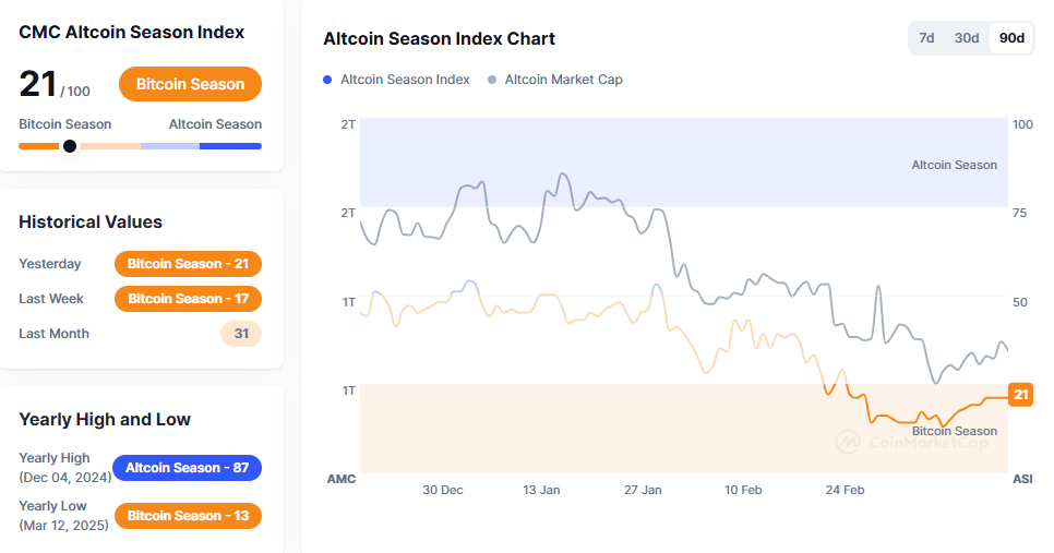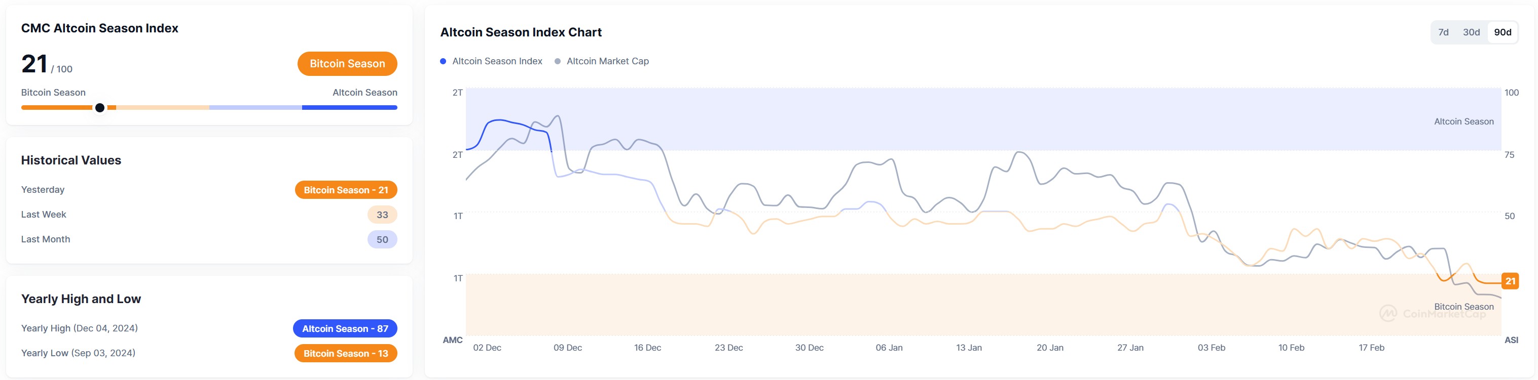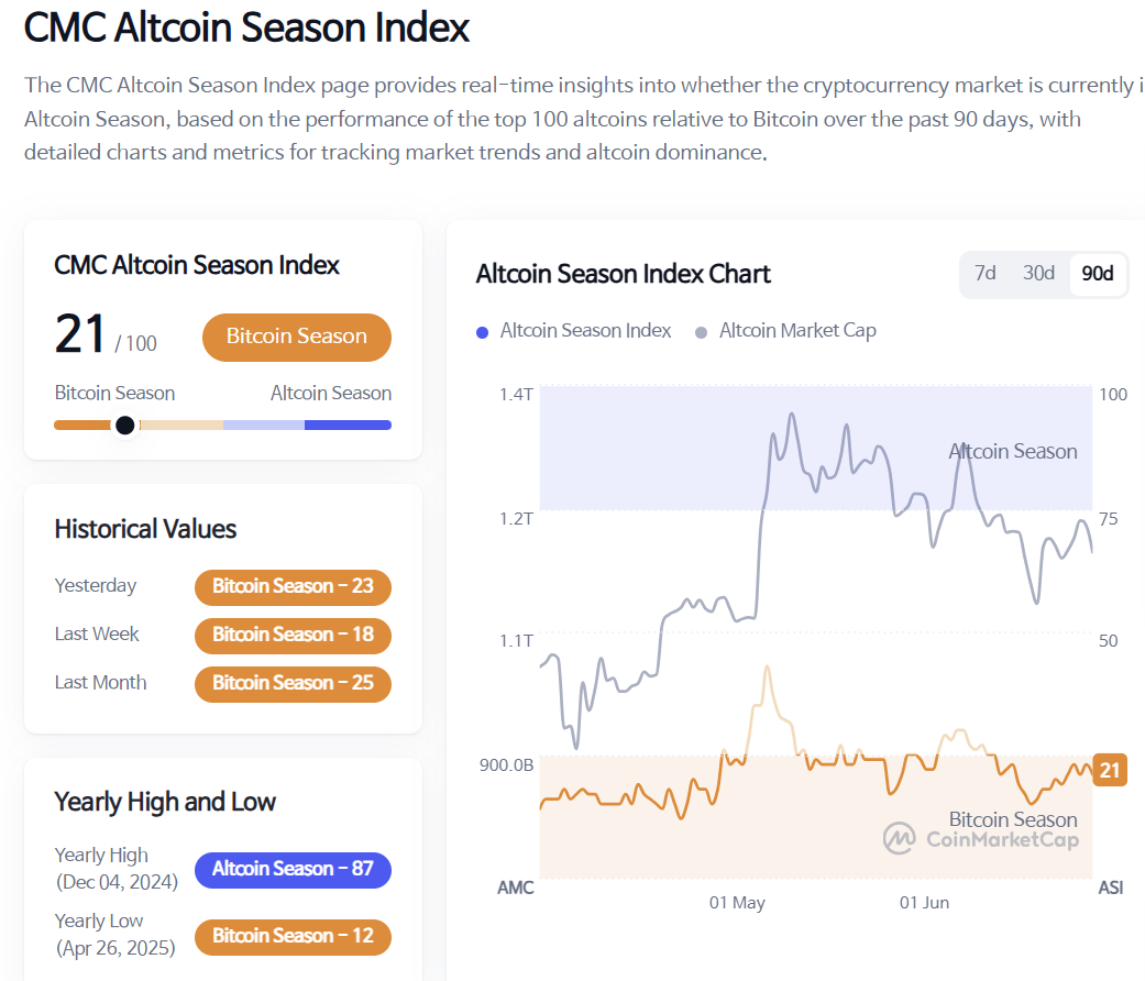 가상자산 종합 정보플랫폼 코인마켓캡의 '알트코인시즌지수'가 전날보다 3포인트 하락한 21을 기록 중이다. 알트코인시즌지수는 시가총액 상위 100개 코인(스테이블·랩트 코인 제외)과 비트코인 간 가격 등락률을 비교해 책정된다. 상위 100개 코인 중 75%의 상승률이 지난 90일 동안 비트코인 상승률보다 높으면 알트코인시즌, 반대의 경우 비트코인 시즌으로 판단한다. 100에 가까울수록 알트코인시즌으로 본다.