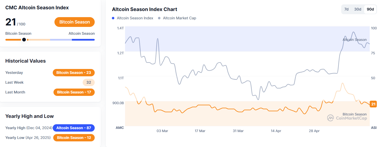 가상자산 종합 정보플랫폼 코인마켓캡의 ‘알트코인시즌지수’가 21을 기록했다. 알트코인시즌지수는 시가총액 상위 100개 코인(스테이블·랩트 코인 제외)과 비트코인 간 가격 등락률을 비교해 책정된다. 상위 100개 코인 중 75%의 상승률이 지난 90일 동안 비트코인 상승률보다 높으면 알트코인시즌, 반대의 경우 비트코인 시즌으로 판단한다. 100에 가까울수록 알트코인시즌으로 본다.