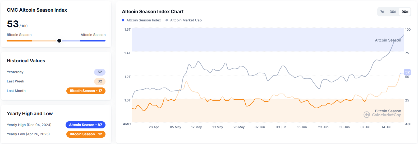 가상자산 종합 정보플랫폼 코인마켓캡의 '알트코인시즌지수'가 53을 기록했다. 알트코인시즌지수는 시가총액 상위 100개 코인(스테이블·랩트 코인 제외)과 비트코인 간 가격 등락률을 비교해 책정된다. 상위 100개 코인 중 75%의 상승률이 지난 90일 동안 비트코인 상승률보다 높으면 알트코인시즌, 반대의 경우 비트코인 시즌으로 판단한다. 100에 가까울수록 알트코인시즌으로 본다.