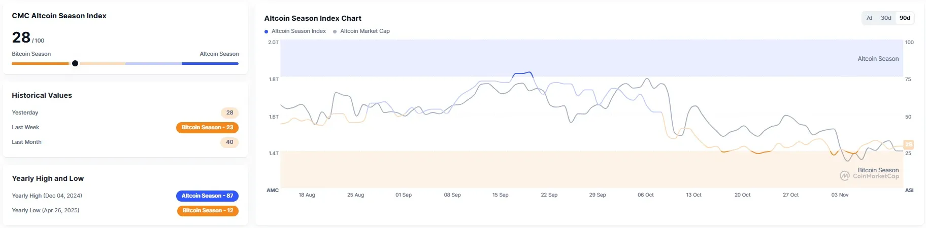 가상자산 종합 정보플랫폼 코인마켓캡의 ‘알트코인시즌지수’가 전날보다 2포인트 오른 28을 기록했다. 알트코인시즌지수는 시가총액 상위 100개 코인(스테이블·랩트 코인 제외)과 비트코인 간 가격 등락률을 비교해 책정된다. 상위 100개 코인 중 75%의 상승률이 지난 90일 동안 비트코인 상승률보다 높으면 알트코인시즌, 반대의 경우 비트코인 시즌으로 판단한다. 100에 가까울수록 알트코인시즌으로 본다.