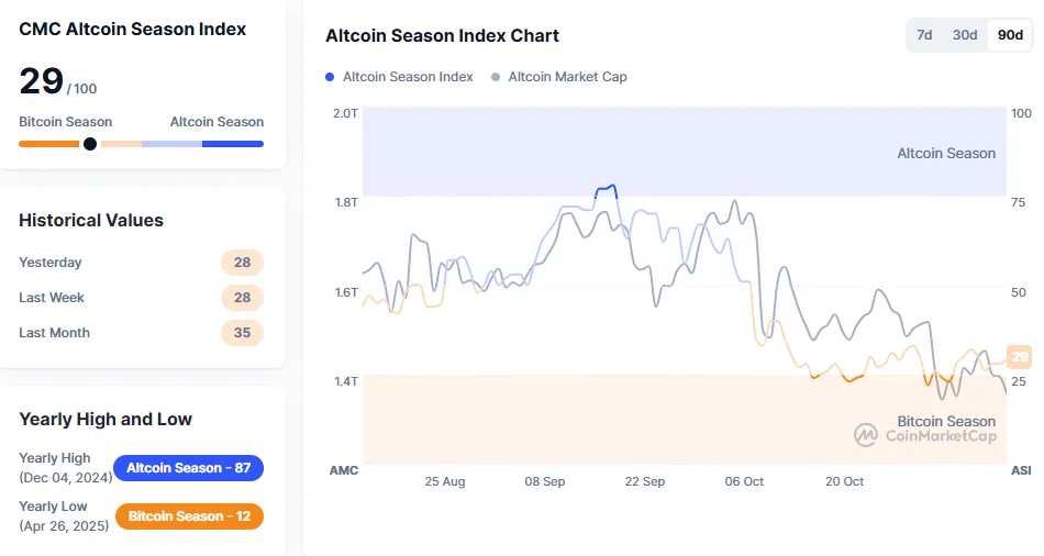 가상자산 종합 정보플랫폼 코인마켓캡의 ‘알트코인시즌지수’가 전날보다 1포인트 오른 29를 기록했다. 알트코인시즌지수는 시가총액 상위 100개 코인(스테이블·랩트 코인 제외)과 비트코인 간 가격 등락률을 비교해 책정된다. 상위 100개 코인 중 75%의 상승률이 지난 90일 동안 비트코인 상승률보다 높으면 알트코인시즌, 반대의 경우 비트코인 시즌으로 판단한다. 100에 가까울수록 알트코인시즌으로 본다.