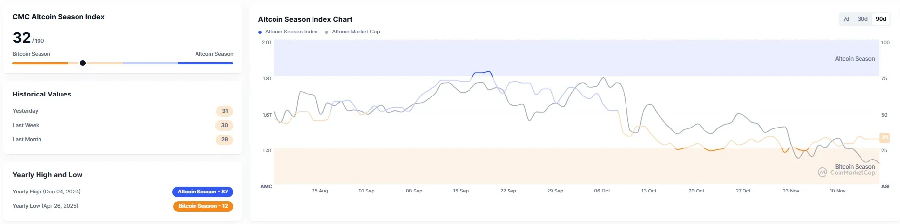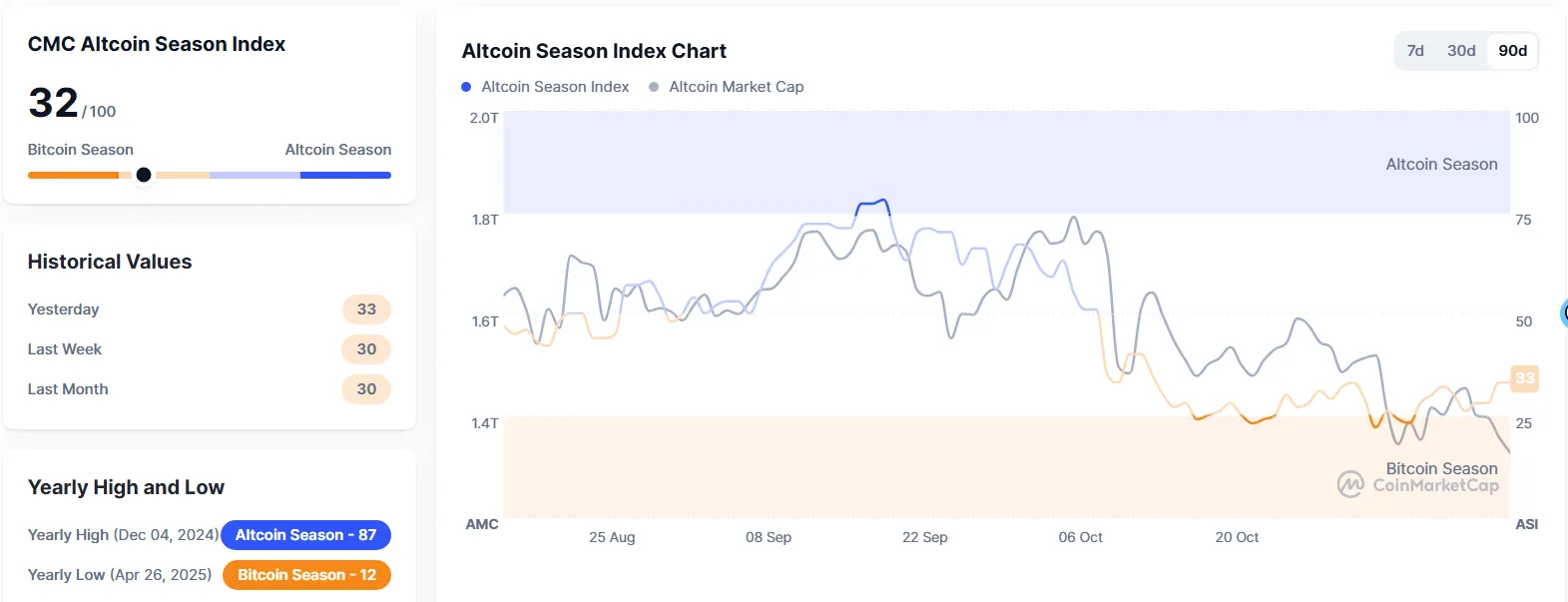 가상자산 종합 정보플랫폼 코인마켓캡의 ‘알트코인시즌지수’가 32를 기록했다. 알트코인시즌지수는 시가총액 상위 100개 코인(스테이블·랩트 코인 제외)과 비트코인 간 가격 등락률을 비교해 책정된다. 상위 100개 코인 중 75%의 상승률이 지난 90일 동안 비트코인 상승률보다 높으면 알트코인시즌, 반대의 경우 비트코인 시즌으로 판단한다. 100에 가까울수록 알트코인시즌으로 본다.