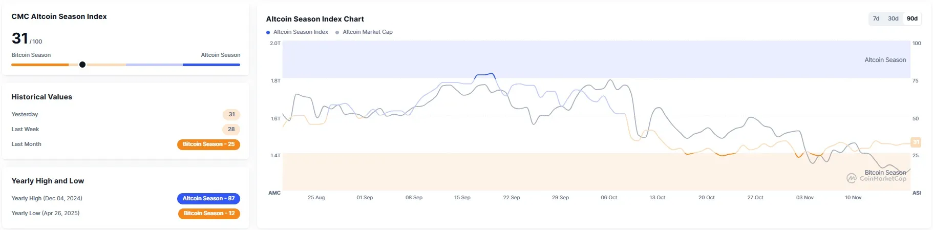 가상자산 종합 정보플랫폼 코인마켓캡의 ‘알트코인시즌지수’가 전날보다 1포인트 오른 31을 기록했다. 알트코인시즌지수는 시가총액 상위 100개 코인(스테이블·랩트 코인 제외)과 비트코인 간 가격 등락률을 비교해 책정된다. 상위 100개 코인 중 75%의 상승률이 지난 90일 동안 비트코인 상승률보다 높으면 알트코인시즌, 반대의 경우 비트코인 시즌으로 판단한다. 100에 가까울수록 알트코인시즌으로 본다.
