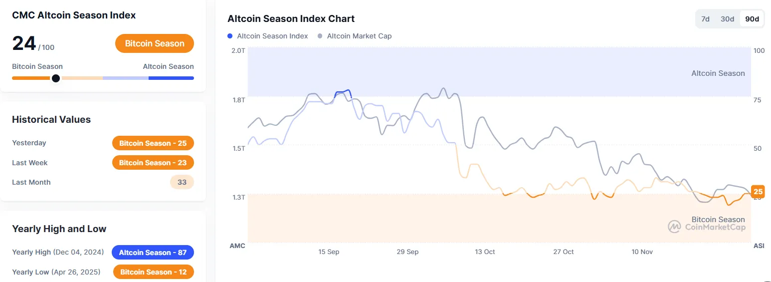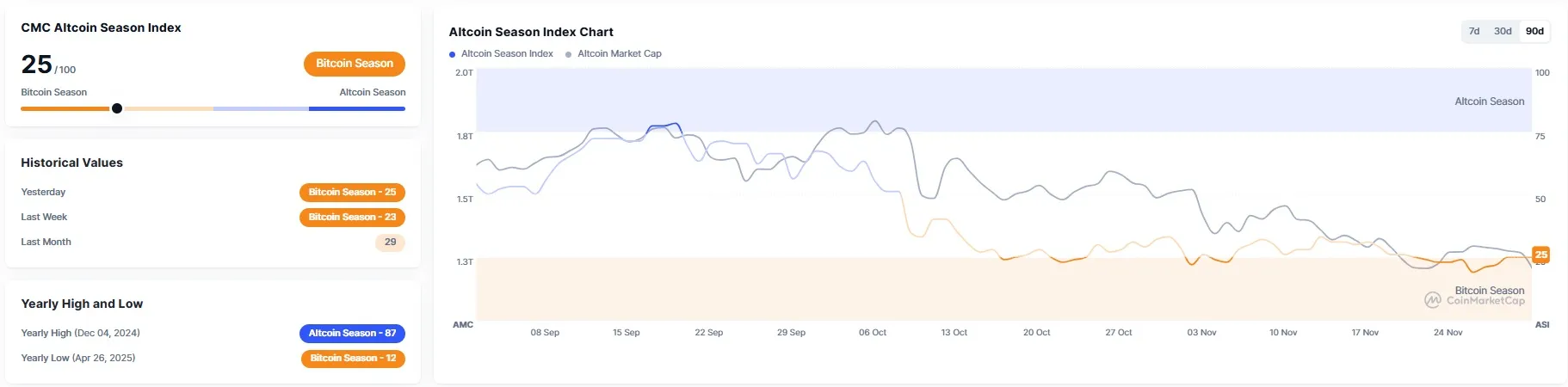 가상자산 종합 정보플랫폼 코인마켓캡의 ‘알트코인시즌지수’가 25를 기록했다. 알트코인시즌지수는 시가총액 상위 100개 코인(스테이블·랩트 코인 제외)과 비트코인 간 가격 등락률을 비교해 책정된다. 상위 100개 코인 중 75%의 상승률이 지난 90일 동안 비트코인 상승률보다 높으면 알트코인시즌, 반대의 경우 비트코인 시즌으로 판단한다. 100에 가까울수록 알트코인시즌으로 본다.