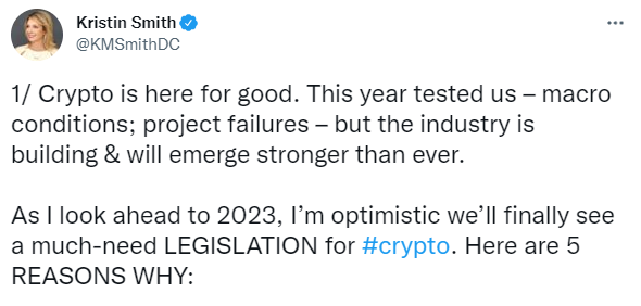 미국 비영리 단체인 블록체인협회 전무이사 크리스틴 스미스(Kristin Smith)가 트위터를 통해 "암호화폐는 항상 존재할 것이고 올해는 거시환경과 일부 프로젝트 실패 등에 따른 시험대에 올랐을 뿐이다. 암호화폐 시장은 앞으로 그 어느 때보다 강하게 부상할 것"이라고 밝혔다. 그러면서 "오는 2023년에는 암호화폐 시장에 반드시 필요한 법안이 가시화 될 것이라고 기대한다. 그 첫 번째 이유로는 정책 입안자와 투자자, 그리고 업계가 법안의 필요성에 대한 공감대를 형성했다. 또 의원들도 상품선물거래위원회(CFTC)가 암호화폐현물 시장을 규제하기 적격이라는 데 동의하고 있다. 2023년까지 암호화폐에 필요한 법안이 가결될 가능성은 40%, 2024년 말에는 60%까지 오를 것으로 예상한다"고 설명했다.