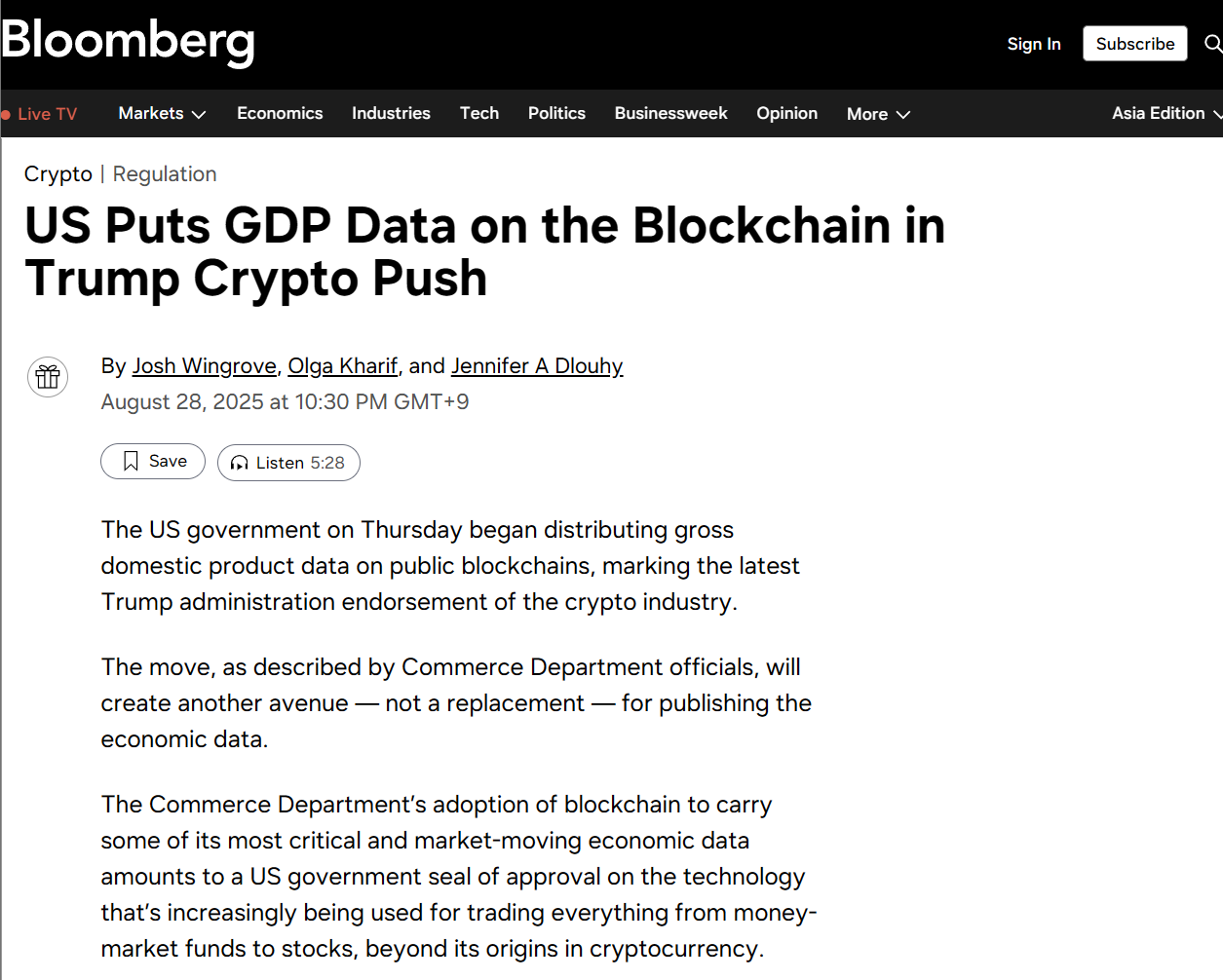 미 상무부가 28일(현지시간) 처음으로 국내총생산(GDP) 데이터를 퍼블릭 블록체인에 배포하기 시작했다고 블룸버그가 전했다. 트럼프 행정부의 친 암호화폐 정책 일환으로, 이번 시범 단계에서는 비트코인, 이더리움, 솔라나, 트론, 스텔라, 아발란체, 아비트럼 원, 폴리곤 PoS, 옵티미즘 9개 블록체인을 대상으로 GDP 데이터 기록이 진행될 예정이다. GDP 데이터 기록 관련 아이디어는 미 상무장관 하워드 루트닉이 주도한 것으로 알려졌으며, 코인베이스와 크라켄·제미니 등이 가스 수수료 지불을 위해 참여했다. 트럼프 역시 통계를 블록체인에 올리는 아이디어에 환영한다는 의사를 내비친 것으로 전해졌다.