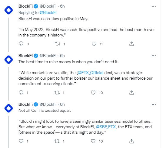 미국 암호화폐 대출 플랫폼 블록파이(BlockFi)가 오늘 새벽 트위터를 통해 "지난 5월 블록파이 현금흐름은 긍정적이었고 역대 최고의 한 달이었다. 시장에 변동성이 존재했지만 FTX와의 최대 2.5억달러 대출 계약은 회사 대차대조표를 건전화하는 데 도움이 됐다. 출금도 문제 없이 처리되고 있다. 지난주 평소보다 출금액이 많았지만 이번주엔 일일 출금 요청이 88% 감소했고, 앞으로도 이러한 추세가 이어질 것"이라고 밝혔다. 이에 대해 암호화폐 전문 미디어 우블록체인은 "블록파이는 보이저디지털처럼 셀시우스, 3ac, 바벨파이낸스에 얼마나 대출해줬는지 공개해야 한다"며 "이는 제네시스 트레이딩, QCP캐피털, GRS 등도 마찬가지"라고 지적했다. 앞서 보이저디지털은 3ac에 15,250 BTC, 3.5억 USDC 대출을 제공했었다고 밝히며, 오는 27일(현지시간)까지 전액 상환을 요구했다.