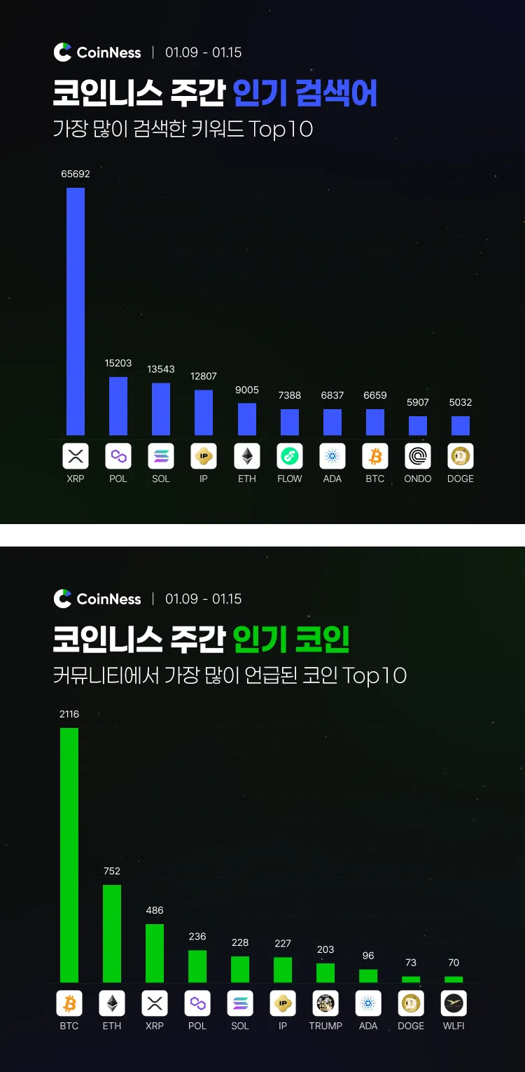 코인니스에서 이번 주(1/9~1/15) 가장 많이 검색되고 이슈가 된 키워드는 다음과 같다.