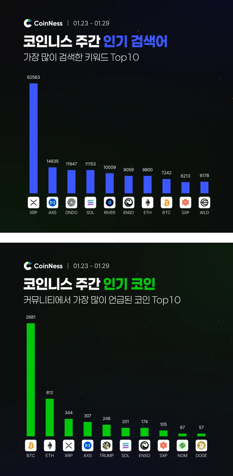 코인니스에서 이번 주(1/23~1/29) 가장 많이 검색되고 이슈가 된 키워드는 다음과 같다.