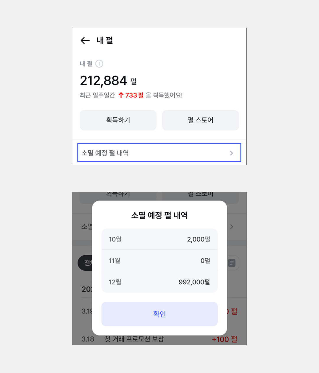 ‘내 펄’ 탭 내 ‘소멸 예정 펄 내역’ 버튼을 누르면 앞으로 3개월 동안 소멸될 예정인 펄의 개수를 월별로 확인할 수 있어요.