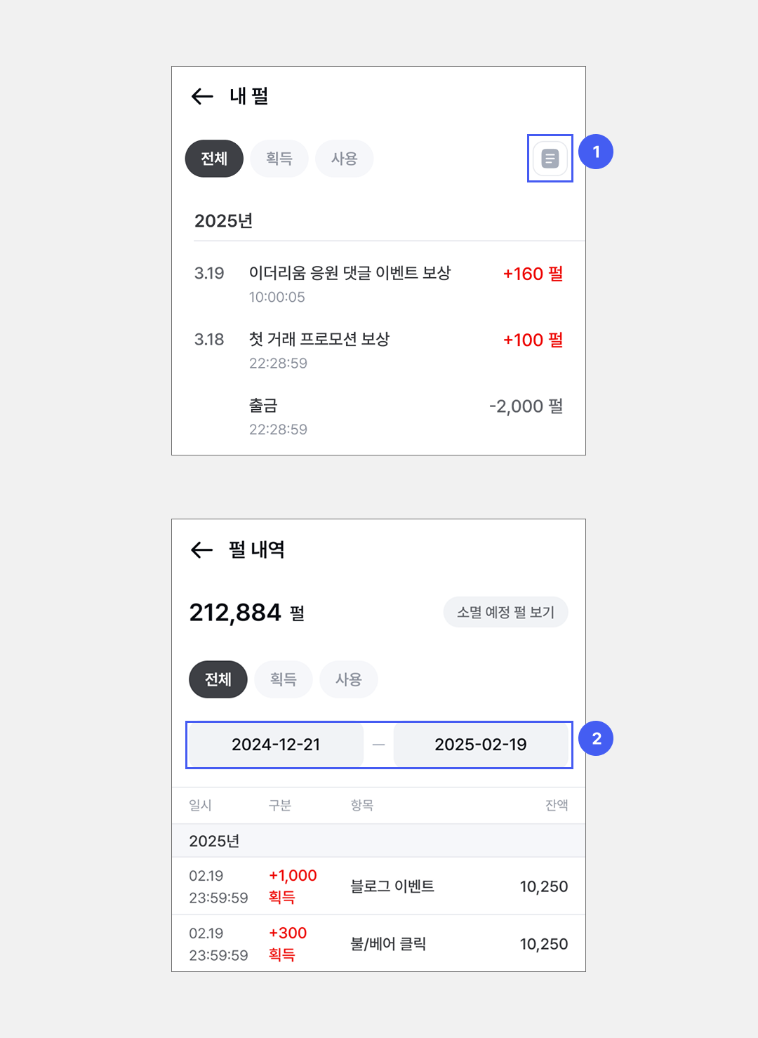 1. 내 펄 내역 리스트 우측 상단 아이콘을 클릭하면 상세 내역 페이지로 이동해요.
