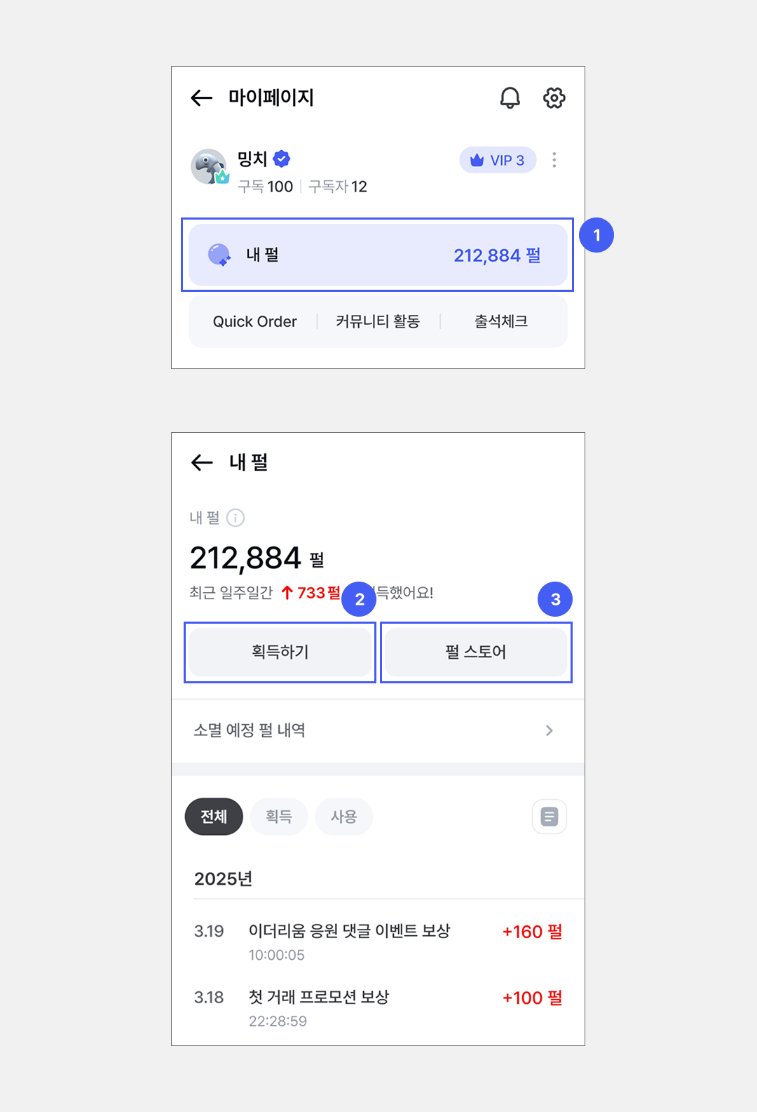 1. 마이페이지 상단 ‘내 펄’에서 누적된 펄 개수를 확인할 수 있어요. ‘내 펄’ 탭을 눌러 펄 획득·사용 내역을 함께 확인해 보세요.