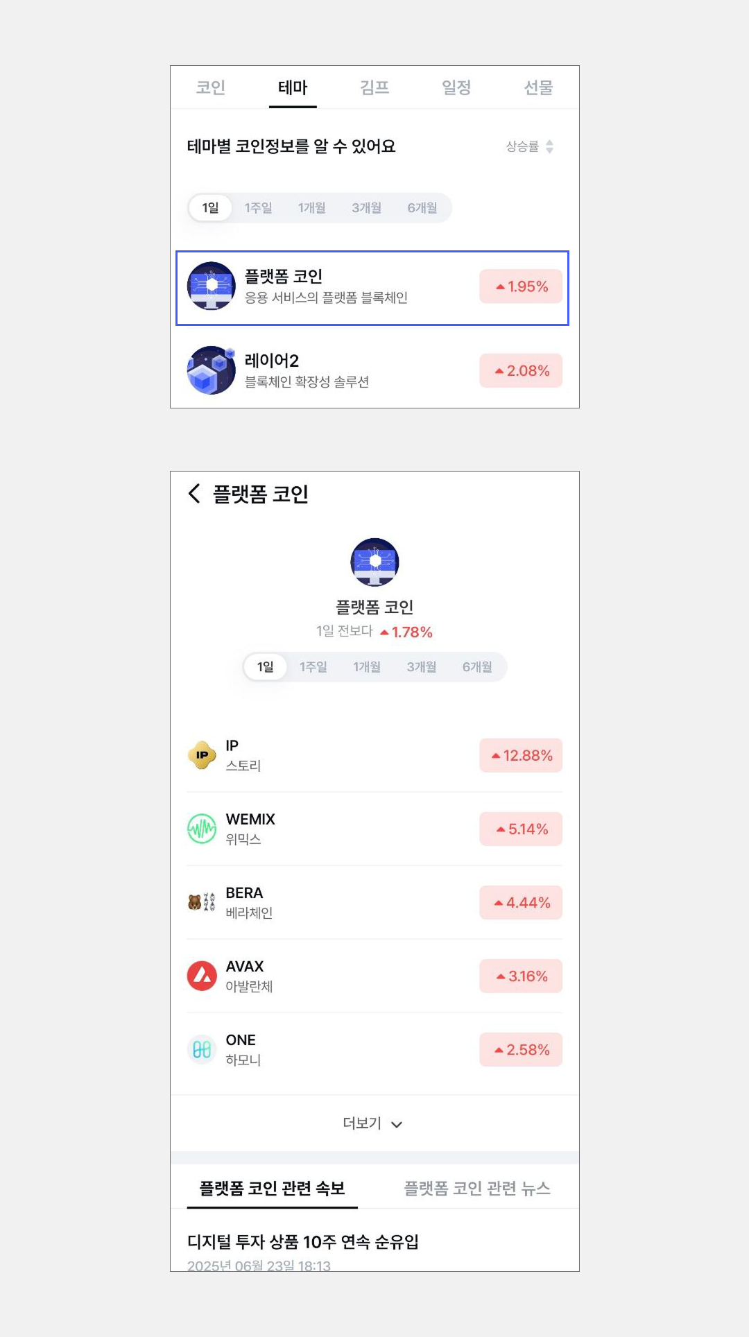 2. 테마 내 코인을 누르면, ‘코인’ 탭과 동일하게 상세 정보 페이지로 이동해 차트, 속보, 뉴스 등 다양한 정보를 확인할 수 있어요.