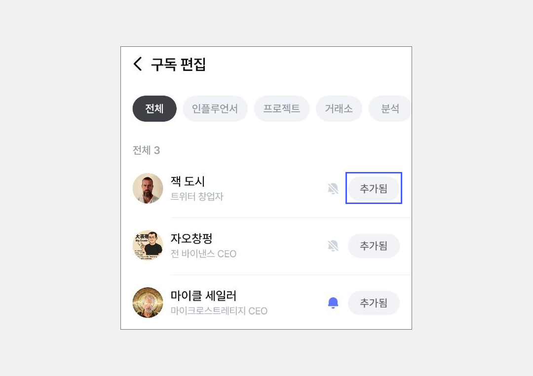 3. 구독 중인 피드 항목 옆의 ‘추가됨’ 버튼을 클릭하면 구독을 해제할 수 있어요.