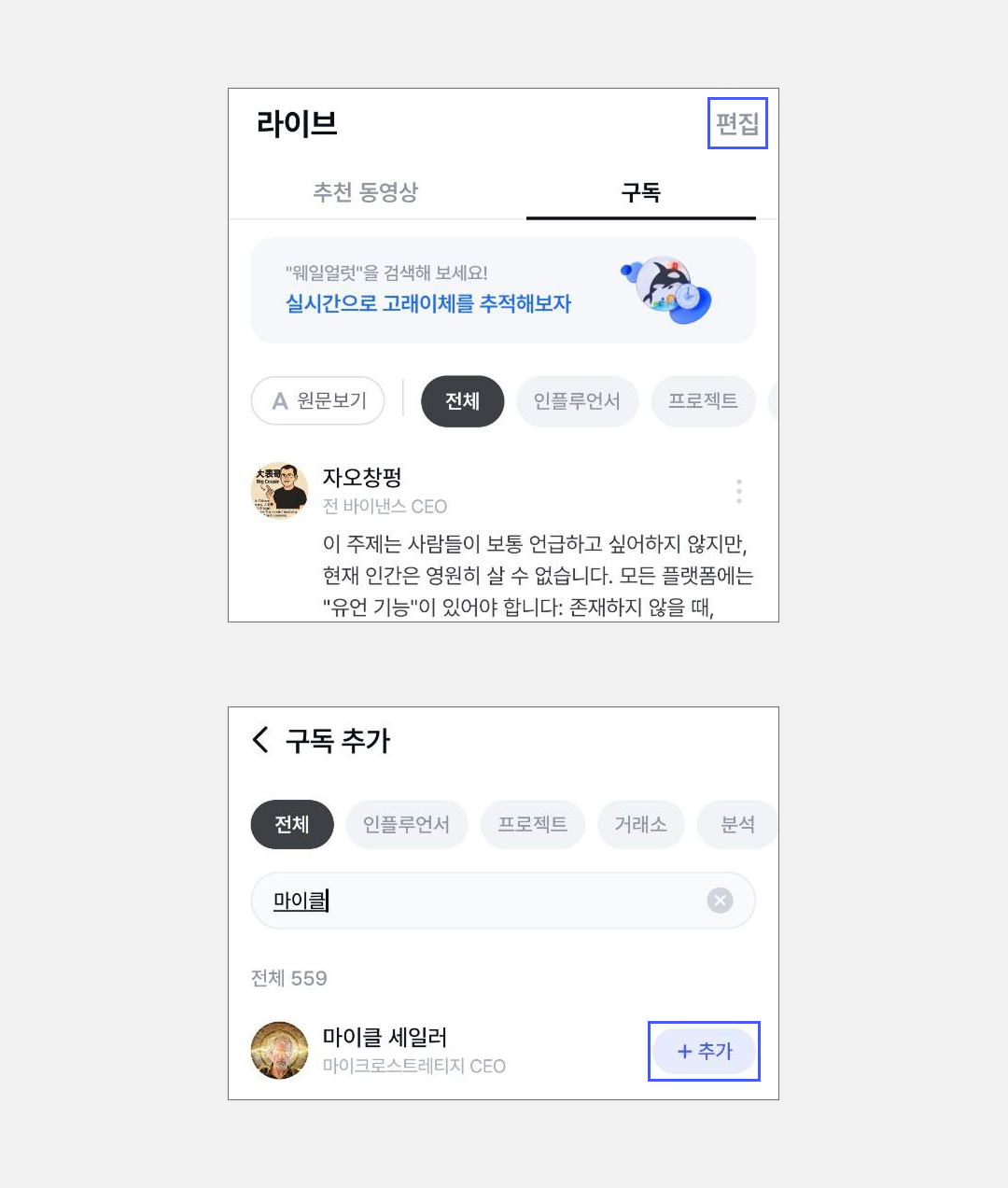 3. 원하는 라이브 피드를 검색한 뒤, 항목 옆의 ‘추가’ 버튼을 누르면 구독이 완료돼요.