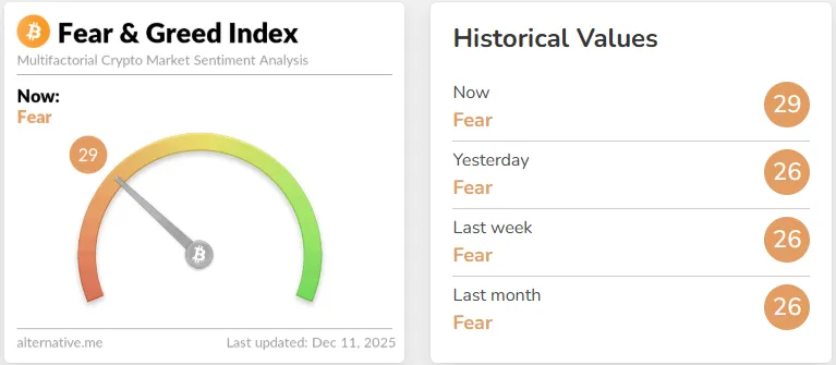 The Crypto Fear & Greed Index rose three points from yesterday to 29, remaining in the fear category, according to data from Alternative. The index measures market sentiment on a scale of 0, indicating extreme fear, to 100, representing extreme greed. It is calculated based on factors including volatility (25%), market volume (25%), social media mentions (15%), surveys (15%), Bitcoin's market dominance (10%), and Google search trends (10%).