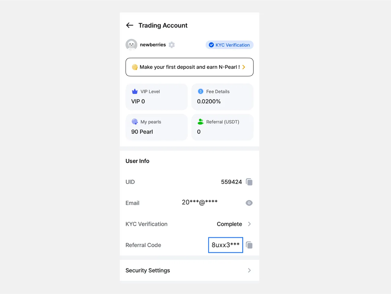 Sau khi hoàn tất KYC Bước 1, bạn sẽ được cấp một mã giới thiệu riêng. Bạn có thể tìm thấy mã này tại mục [Tài khoản giao dịch] hoặc [Giới thiệu].