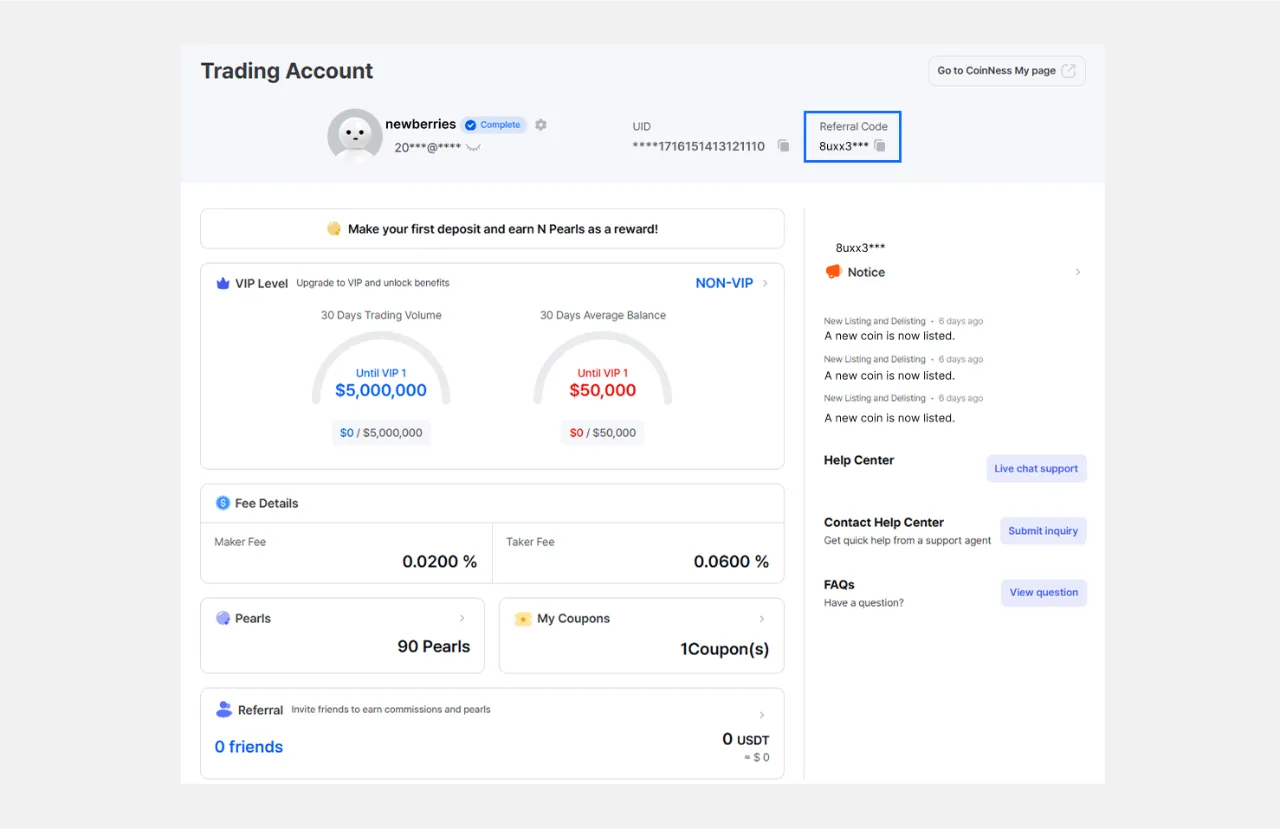 Chương trình giới thiệu của Coinness sẽ thưởng cho bạn một phần phí giao dịch của bạn bè được bạn mời. Bạn mời càng nhiều người và họ giao dịch càng nhiều, bạn càng kiếm được nhiều hoa hồng.