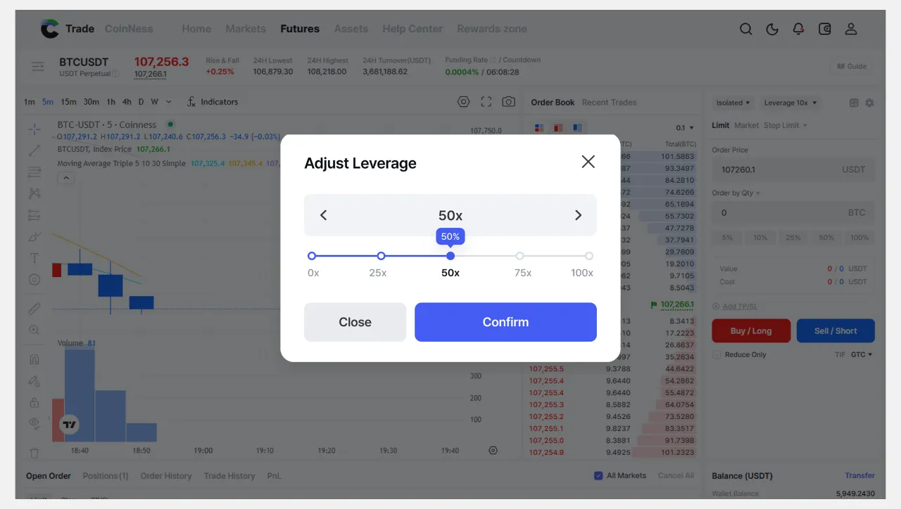 Trước khi giao dịch hợp đồng tương lai, bạn có thể chọn đòn bẩy cho từng cặp giao dịch.