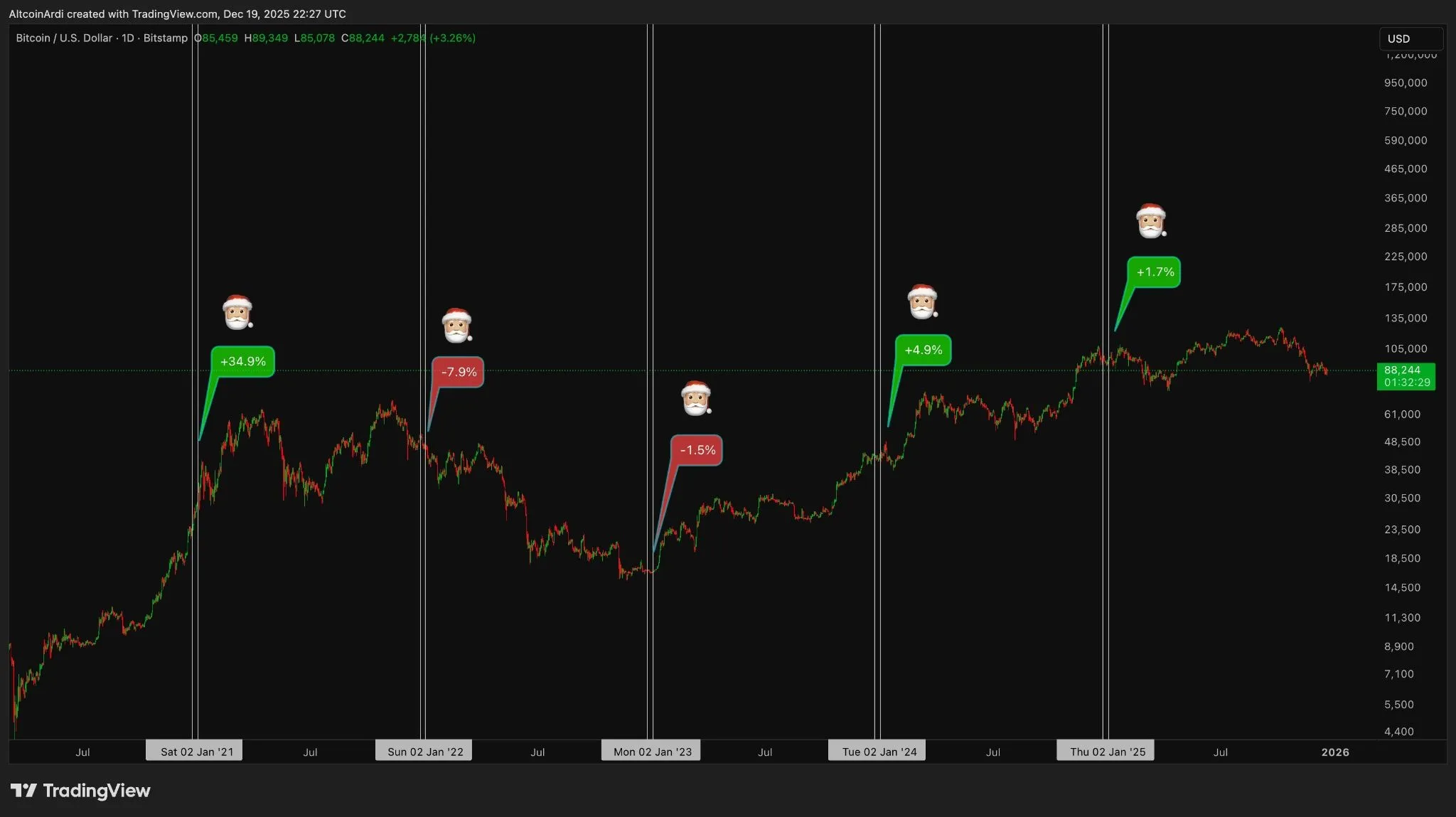 The traditional Santa Claus rally for Bitcoin has shown a trend of diminishing returns and dominant selling pressure over the past five years, according to on-chain analyst Ardi, Cointelegraph reported. The analyst noted that while Bitcoin surged 34.5% during the 2020 rally, year-end returns have progressively weakened in recent years when excluding that outlier.