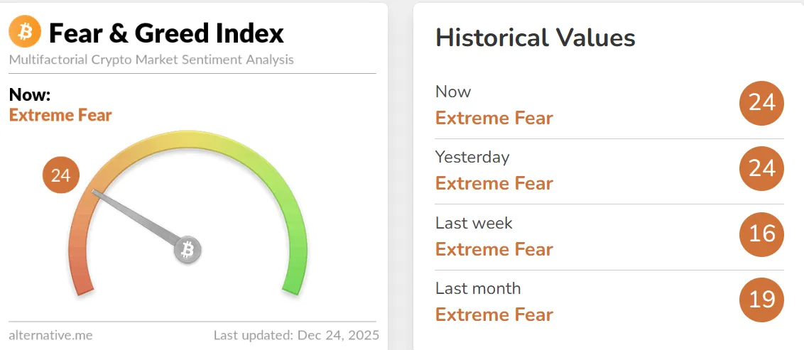 The Crypto Fear & Greed Index, compiled by data provider Alternative, stands at 24, unchanged from yesterday and keeping the market in a state of extreme fear. The index measures sentiment on a scale where 0 represents extreme fear and 100 indicates extreme optimism. It is calculated based on volatility (25%), trading volume (25%), social media mentions (15%), surveys (15%), Bitcoin's market cap dominance (10%), and Google search volume (10%).