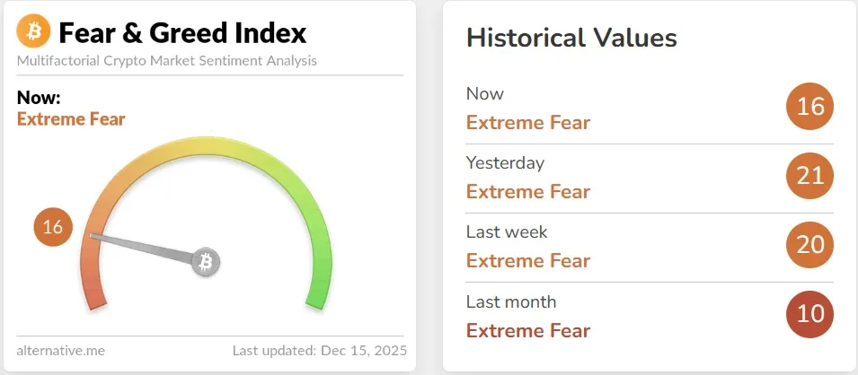 The Crypto Fear & Greed Index from data provider Alternative has fallen five points from the previous day to 16, maintaining the market's state of extreme fear. The index measures market sentiment, where a value closer to zero indicates extreme fear and a value closer to 100 signifies extreme optimism. It is calculated based on several factors: volatility (25%), trading volume (25%), social media mentions (15%), surveys (15%), Bitcoin's market cap dominance (10%), and Google search volume (10%).