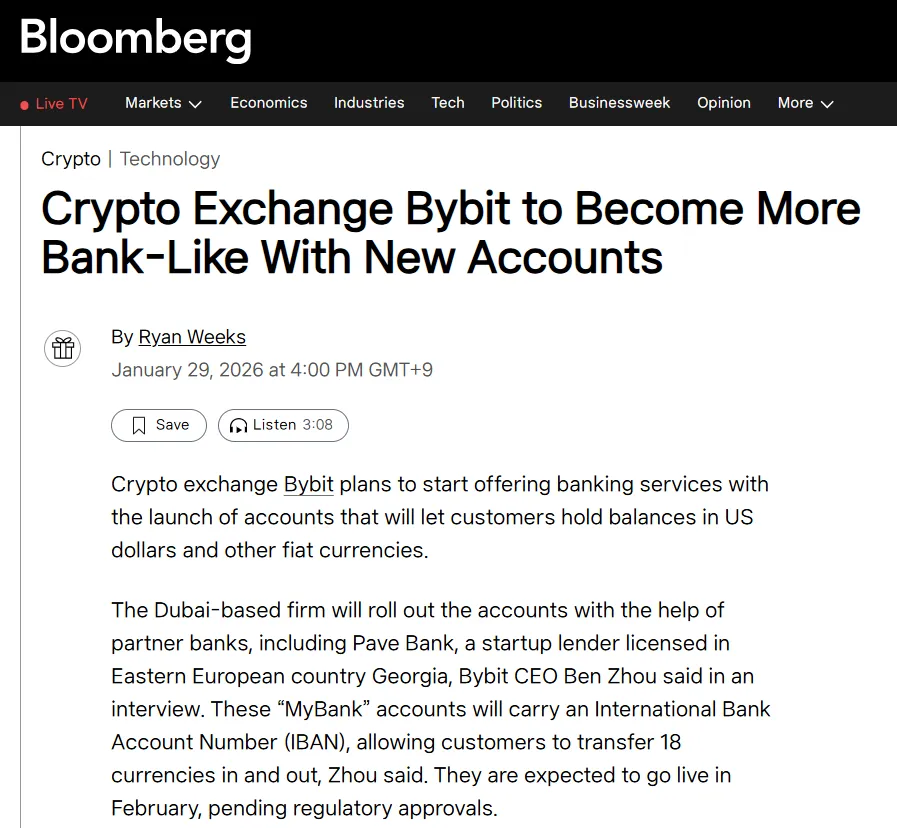 Bybit is expanding into the banking sector by launching an account service that allows users to hold fiat currency balances, Bloomberg reported. CEO Ben Zhou said the company plans to introduce the service in partnership with licensed banks, including Fave Bank in Georgia. The accounts will be assigned an International Bank Account Number (IBAN) and will support transfers in 18 fiat currencies. The launch is scheduled for February, pending regulatory approval. Additionally, Bybit is preparing to release a custody product to support real-world asset (RWA) tokenization for institutional investors. The company is also exploring collaborations with licensed partners in the U.S. and is in discussions with major banks about a U.S. stock market listing as a long-term goal.